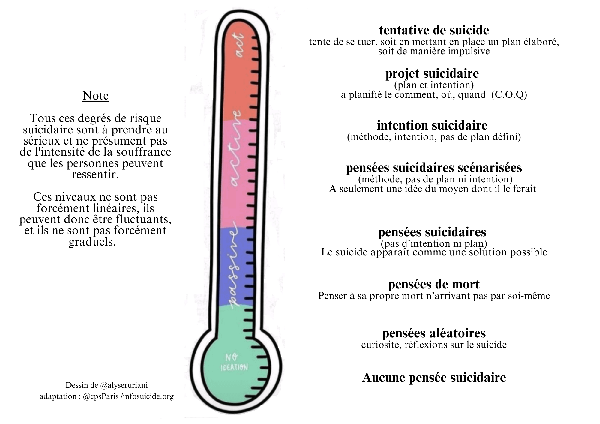 Les idées suicidaires : Pensées tournant autour du suicide (idées, impulsions, tentations, décisions, plans, formulés ou non).